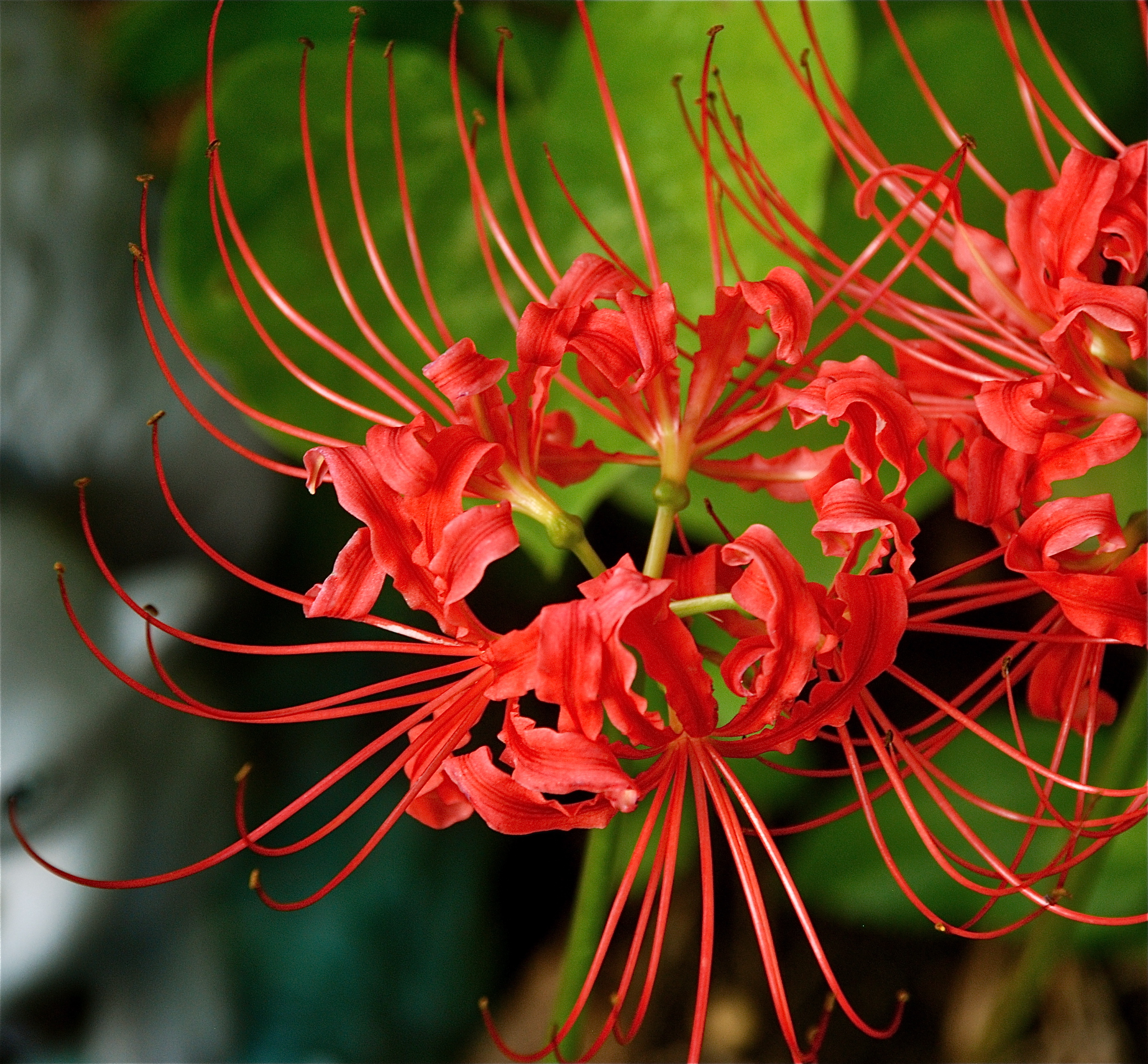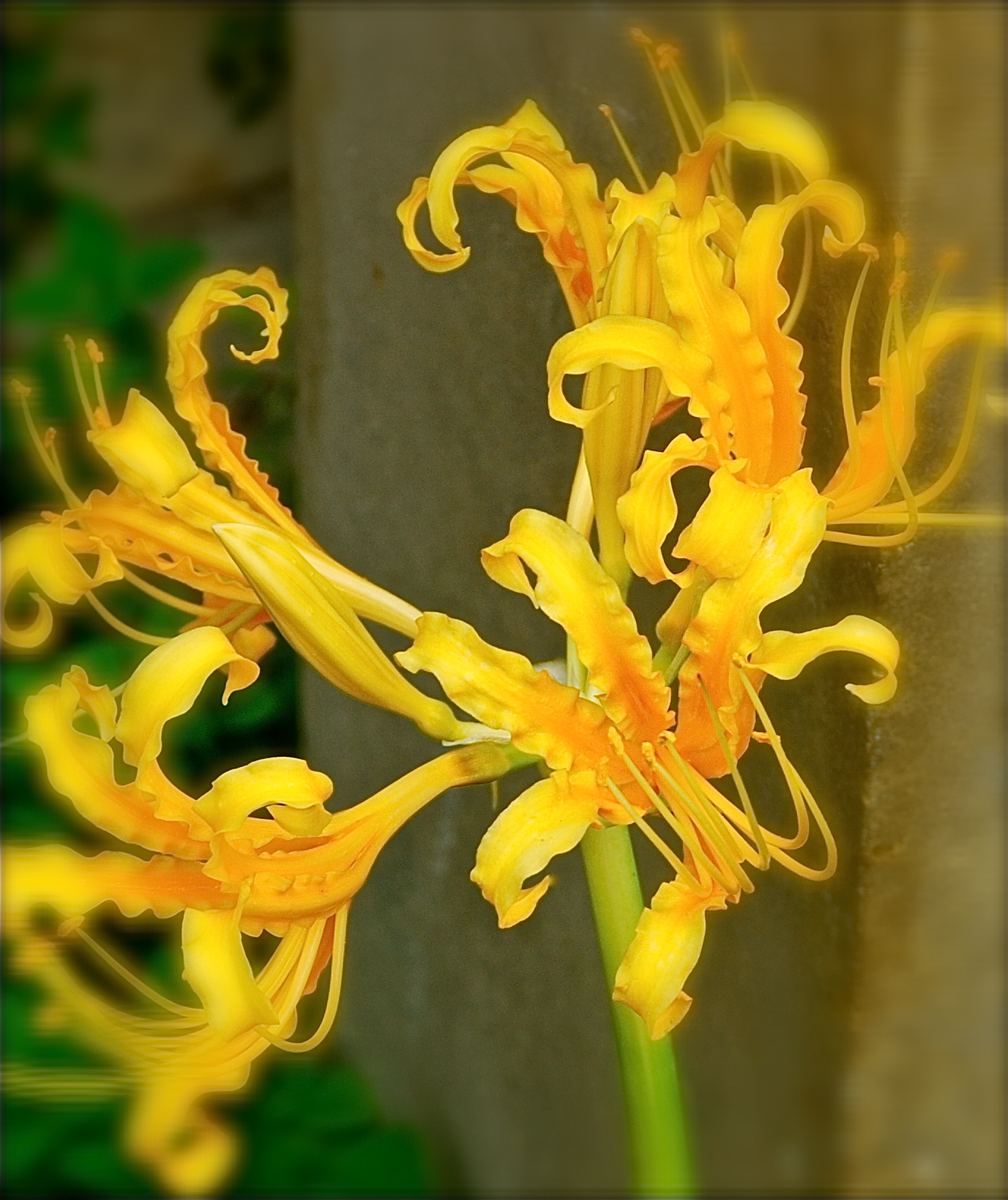 The beauty in the photo above, like the summer sun, is the color of gold. And her petals have slightly wavy edges that seem to mimic the summer’s waves of heat that lead up to her appearance in the garden where she winks at people passing by with her long, wispy eyelash-like stamen. In Latin the word “stamen” means “thread of the warp,” and it was Emerson who birthed the idea that “days are made on a loom whereof the warp and woof are past and future time.” Apparently what he said ‘tis true since these threads of the warp are definitely forerunners of the future. When they appear in the garden, hurricane season has begun and autumn is drawing near. But who is she, this fair maiden dressed so elegantly in gold? She and others like her are called Golden Spider Lilies, Naked Lilies, Surprise Lilies, Golden Hurricane Lilies, and/or Lycoris. But whatever one calls them, they’re always dressed in their rich, apricot-yellow-orange finery, and their blooms which appear late in the summer after their leaves have disappeared create a lovely sweeping quality in the garden. The official name of the species is Lycoris aurea, and it originated in China where it is known as “Hudixiao” (Suddenly The Soil Shines). But she is not an only child; for she has an amazing sibling, Lycoris radiata, the Red Spider Lily.