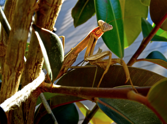 (a camouflaged praying mantis on the rubber plant / Julie Cook / 2015) at: https://cookiecrumbstoliveby.wordpress.com/2015/08/28/what-do-you-see-2/