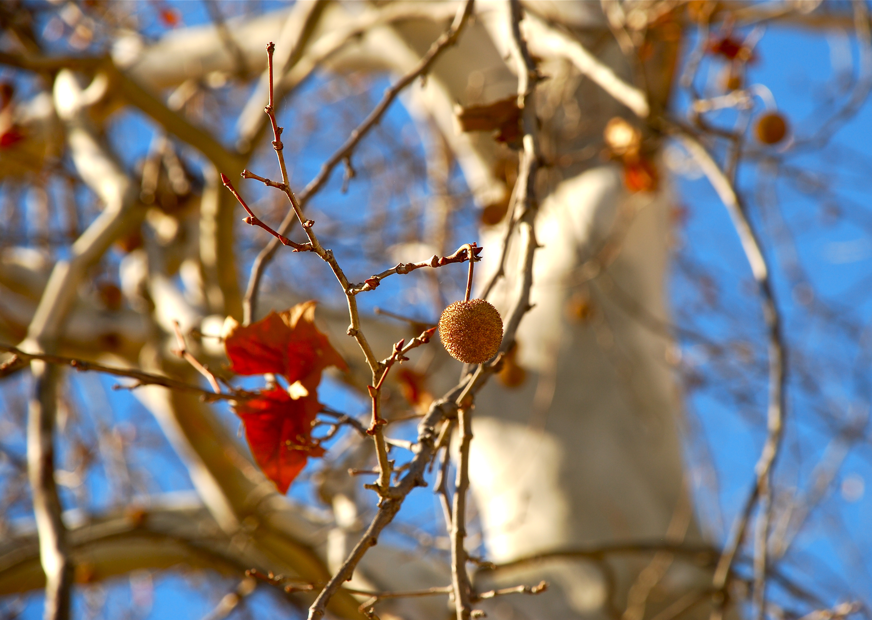 Before the sun fell over the edge of the world yesterday, it painted its recently traversed path with reddish-pink and mauve streaks.  In between the streaks were smaller golden rays that eventually blended into the pinker bands of light.  As these streaks shot up to the sky’s pinnacle, they oozed deliciousness through the open spaces in one of my favorite trees.  It’s a sycamore tree directly across the street from our house, and it’s so old that most of its bark has fallen away.  When it has, as it has now, lost most of its floppy brown leaves the tree’s strange fruits are more visible as area its long, slender alabaster arms, arms that seem to reach up and caress the heavens’ spacious blue lagoons.  Another thing I love about this particular tree is that in winter’s chilling winds its clattering branches seem to whisper prophecies of another spring’s birthing beneath the soil in silent chambers waiting for the prompting of the sun’s warmth on lengthening days and spring rains.