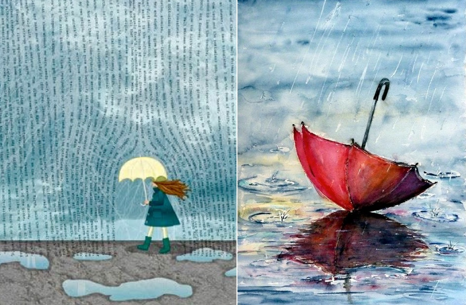 **The poet Walt Whitman writes of a conversation he once had with the rain as it dropped gently from the heavens. “Who are you?” the poet asked. Strangely, the raindrops replied and the poet translates its answer for the readers. “I am the poem of the earth,” said the rain. The rain adds that it is born in the form of invisible and intangible vapors that rise eternally from the earth’s land and deep water bodies. It then reaches heaven (the sky) and changes its appearance complete to form clouds of abstract, changeable shapes. Yet, at its core, it remains the same as it was at birth. It then returns to earth as little droplets which wash away the dust and rejuvenate the drought-ridden, dry land. New plants find life which would have otherwise remained hidden and unborn inside the land as mere seeds. Thus, this perpetual cyclic lifestyle ensures that the rain retunes to its origin, the earth, giving it life, and making it pure and beautiful. The poet realizes that the rain’s life is similar to that of any song. A song’s birth place is the poet’s heart. Once complete, it is passed on (wanders) from one person to another. It may change (reck’d) or remain the same (unreck’d) as it travels, but one day, it returns to the poet with all due love of the listeners. The poem is written from the point of view of someone who asked the rain who it was and was answered, it saying “I am the poem of the Earth”, then proceeding to tell how it comes from the earth, only to return once again to wash it and nourish it…that if it were not for the rain, seeds would remain seeds and not flower into their full potential…giving back life to its origin. Then the poem’s “turn” uses this story as a segway to show how “song, issuing from its birth-place, after fulfillment, wandering, Reck’d or unreck’d, duly with love returns.” Meaning that songs come from the soul and after they’ve been heard, and thought good or bad, return with love. Just as rain rises and falls back again, so do poems, songs and other forms of beauty from the soul. (In the photo on the left side of the collage, the artist penned the words to Whitman’s song as the drops of rain.)