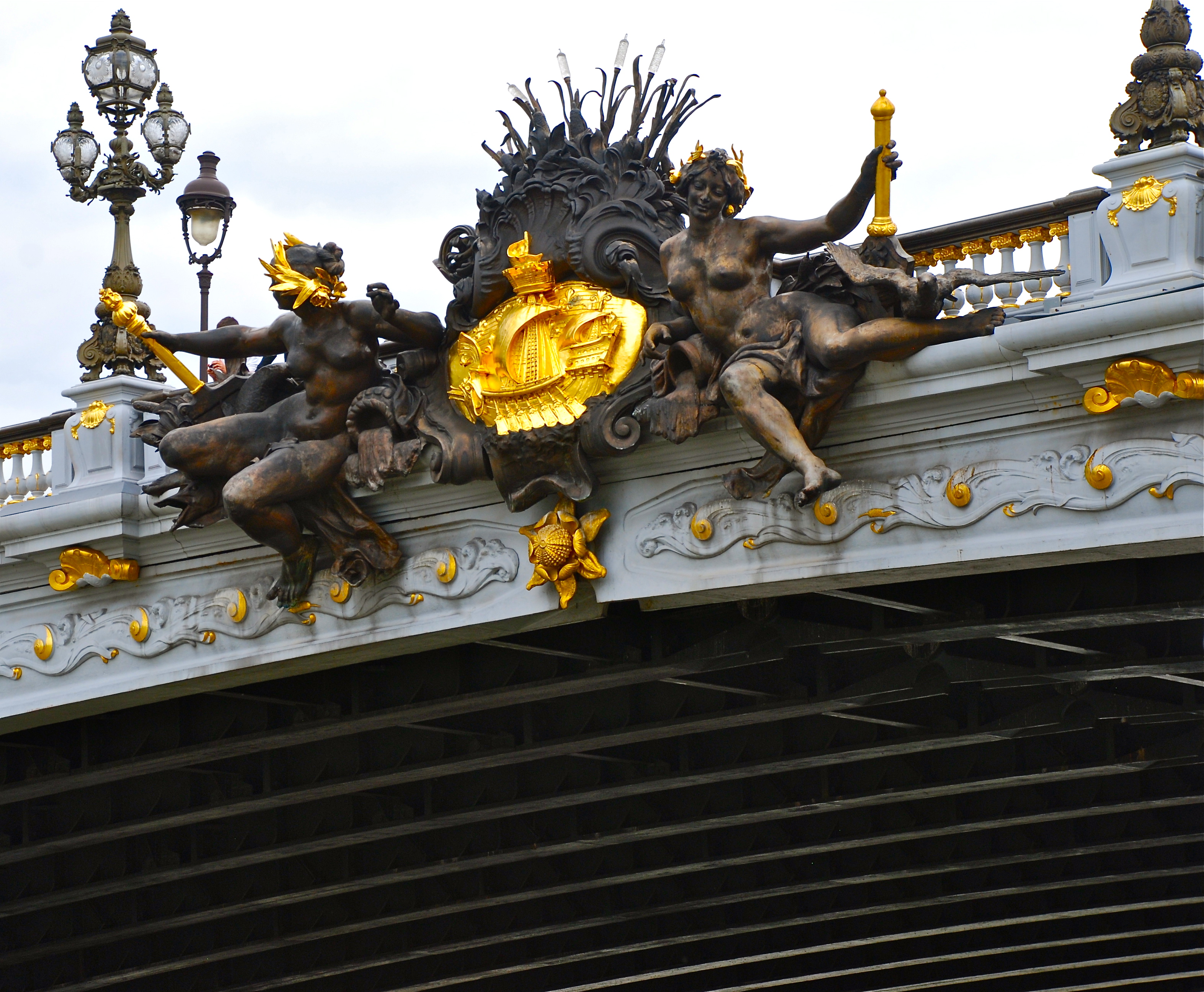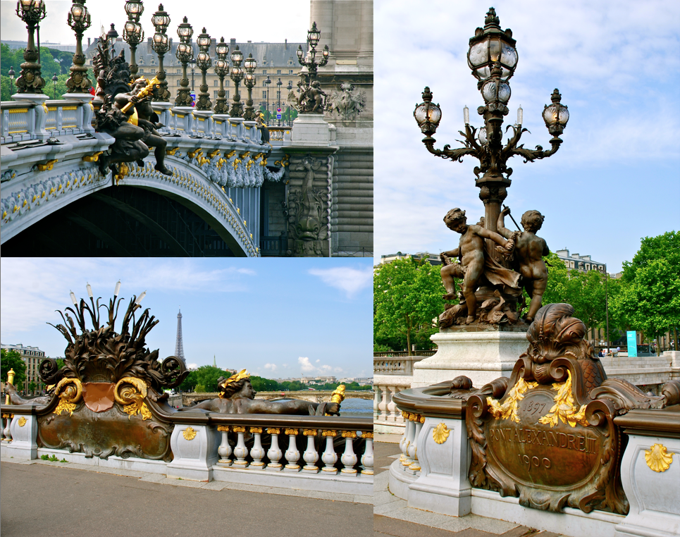 **The Pont Alexandre III, the Beaux-Arts style bridge, with its exuberant Art Nouveau lamps, cherubs, nymphs and winged horses at either end, was built between 1896 and 1900. It is named after Tsar Alexander III, who had concluded the Franco-Russian Alliance in 1892. His son Nicholas II laid the foundation stone in October 1896. (Pictures in collage are mine.)