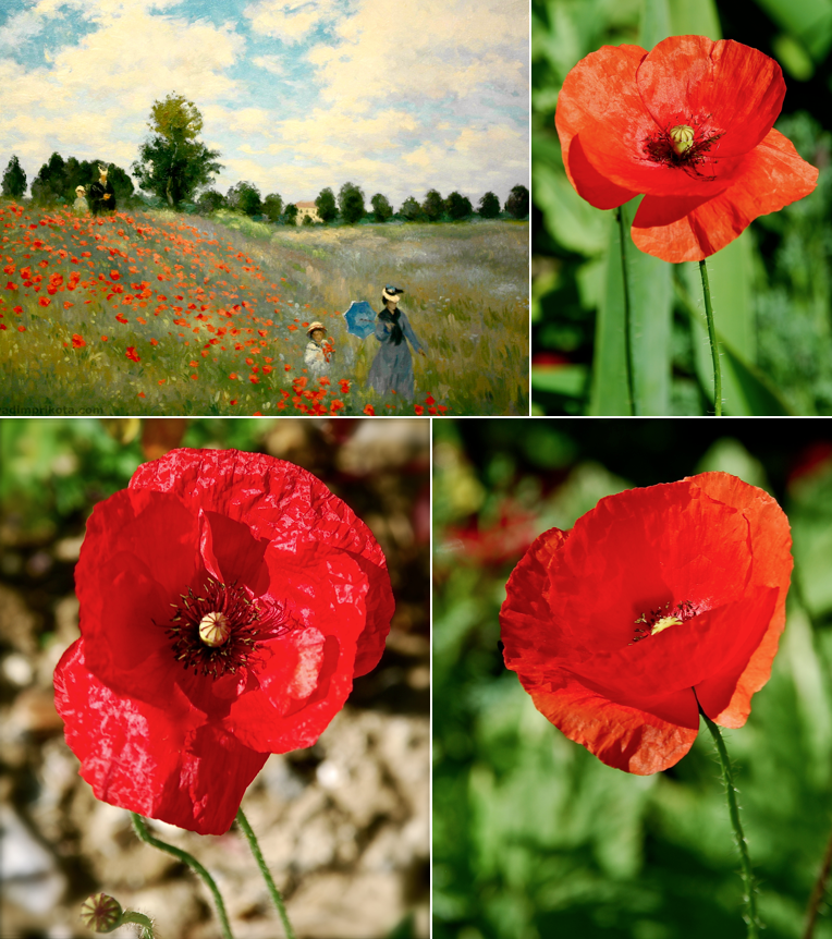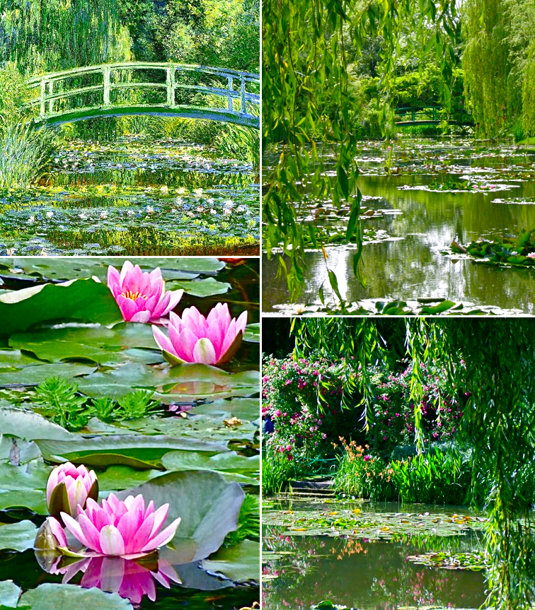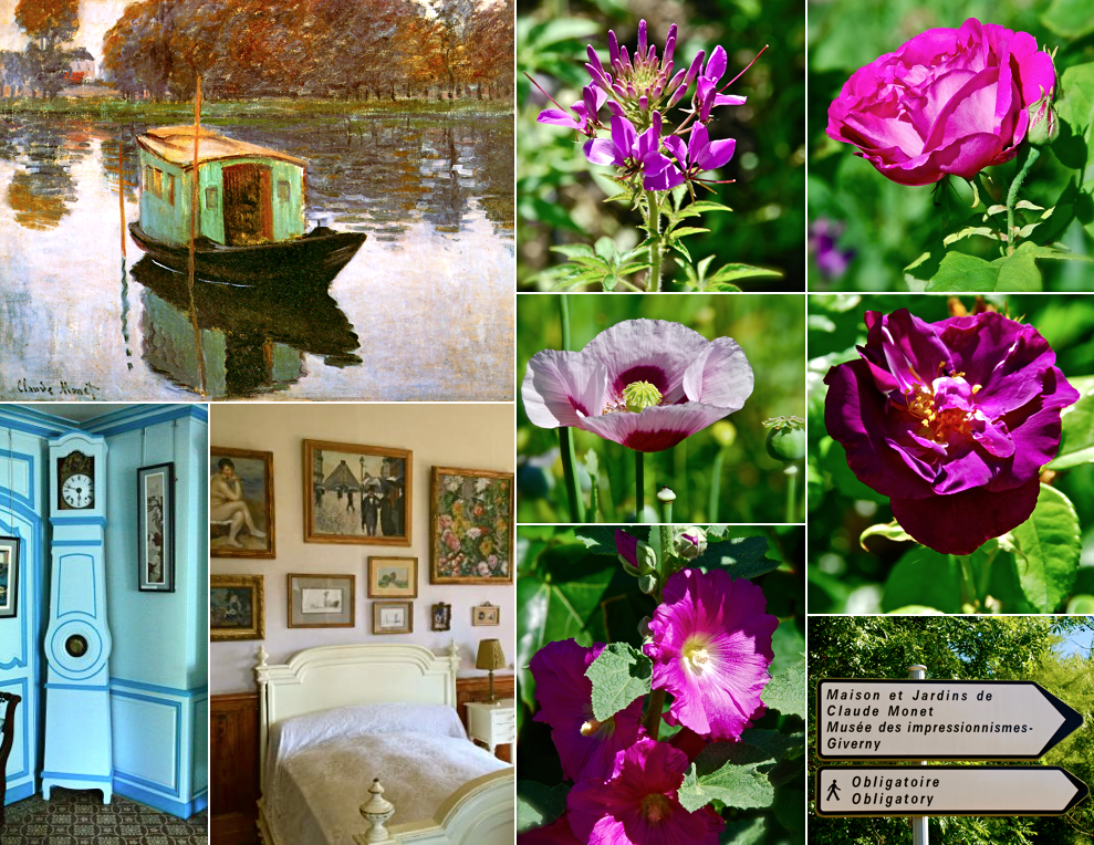 **I found the above information about Monet on the Internet; the first collage I created included my photos of poppies at Giverny along with a photo of Monet’s famous “poppies” painting. In the second collage I included a photo of one of Monet’s paintings of his Japanese bridge and lily pond along with some photos I took of such. Then for the final collage I used a photo of a signed painting of his studio boat and an assortment of flowers I found at Giverny along with a part of two rooms in his house and signs pointing the way to Giverny.