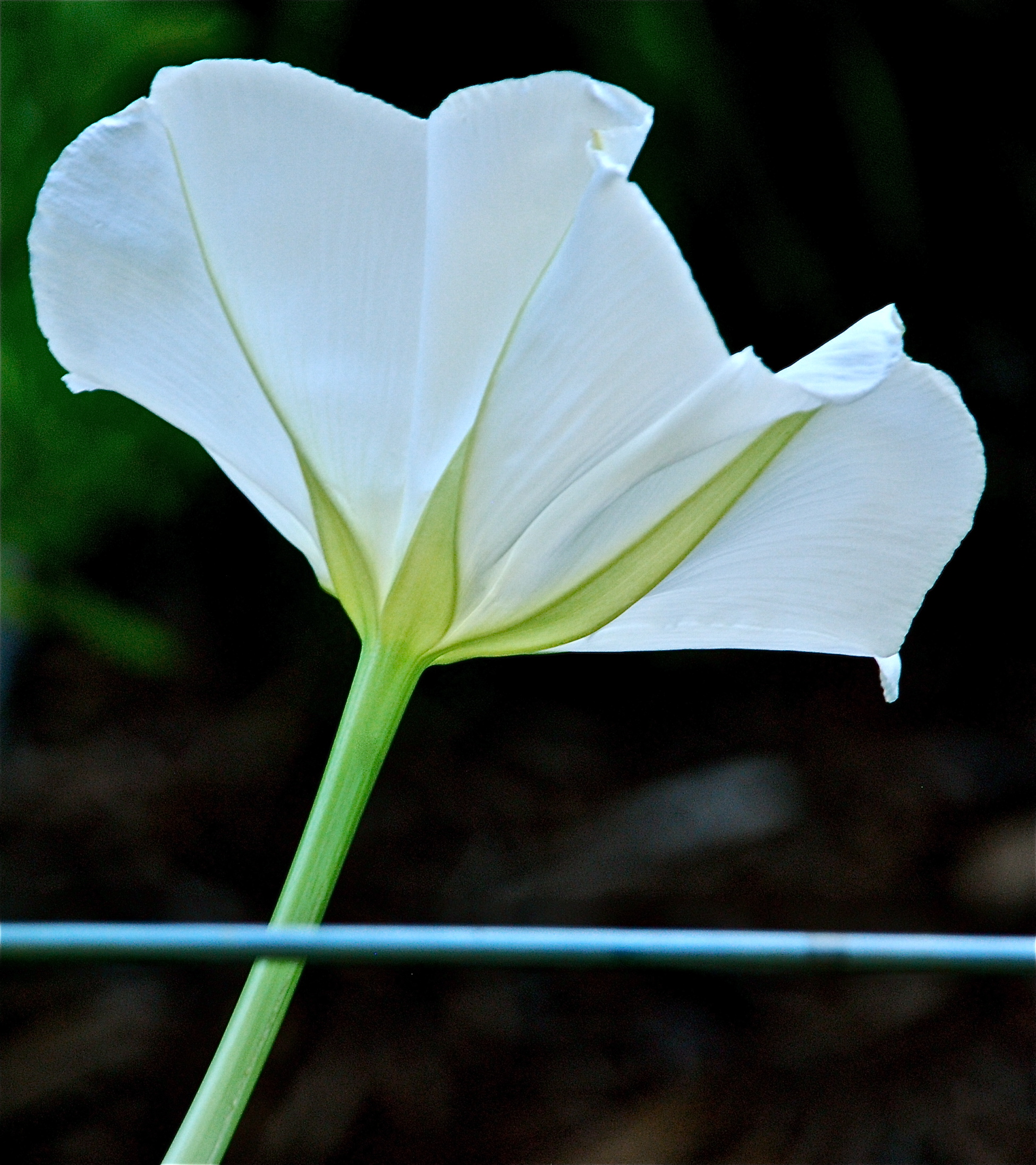 The air was crisp and cool; day’s light had just slipped away.  Wet blades of grass sparkled in a kind of diamond-dusted majesty under the glow of a rising harvest moon.  As if to punctuate my scattered thoughts, tiny aircraft lights glided from time to time through the darkening indigo sky.  When I began glancing around the yard, the images that confronted me seemed to be popping up like photos in a slowly advancing slide show.  The first one I saw was of the red turk’s caps underneath the rose arch, then the white moonflowers on the neighbor’s fence, fattening seed pods under the oak, a Celtic cross, a flying moth, an intermittently  shrouded moon.  The spell was broken only for a short while when the fragrance from my potted herbs temporarily seduced my nose.  Then the slide show started up again with a flash of yellow and white lights, followed by a rustling noise, leafy branches hanging low, a sculpted monk, stone rabbits, and a fleeting little lizard.  Music in the distance floated down the alley, and when I turned to follow the sound, I was startled by ghostly shadows dancing on the shed in the deepening darkness.  However the fear was fleeting and not enough to alleviate my growing sleepiness.  It wasn’t until water tapped noisily in the nearly drained fountain and a pair of feral cats came meowing at my feet that I was jolted out of my reverie.  And it had been such a lovely respite for a weary soul, always is when under the holy hosts of heaven that light the night.