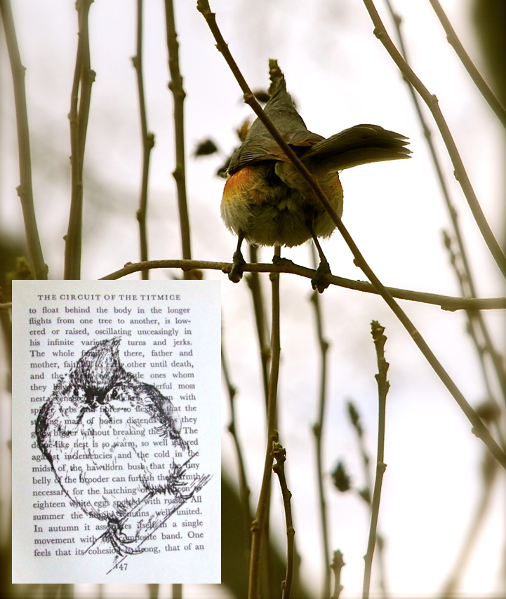 Is this little guy cute or what! I first saw it yesterday while I was out taking pictures. What made me aware of its presence was the unusual twittering noise I heard above me. Wanting to know what creature’s “curious ditties” had broken into my solitude, I turned around and listened for it to come again. When it did, I spied the little thing sitting up high in the branches of the still barren, woody althea shrub. At first glance and seeing only its back side I thought the bird was a small female cardinal but the longer I stood there peering up at it, the less convinced of that idea I was. Finally it dawned on me what it was even though until then I’d only seen photographs of titmice in books. Of course my first instinct was to raise the camera and snap away, but since I didn’t know how skittish this bird might be, I decided to stand very still for a few more minutes. When I did start shooting, the titmouse continued on about its business seemingly quite unconcerned about my presence, so much so that instead of flying away it proceeded to move, hop by hop, closer to the adjacent peanut feeder. As it turned out the tufted darling, at least this one, was quite the “ham” because it would stop from time to time and look right at me as if posing for the camera. Once its hunger was satiated, the titmouse flew away, but I somehow knew this one would come again. And sure enough it returned today. Its curious little twittering noise alerted me of the bird’s presence, and I, delighted to see it, only watched from afar this time. Life here on planet earth is undeniably fraught with hardships and brutality, but every now and again it gives the appearance of being the untroubled paradise it once was. Where? Mercifully in the little piece of Eden that a garden is the difficulties and noise of a fallen world are sometimes silenced long enough for paradise to reveal itself once again if only for a short while.