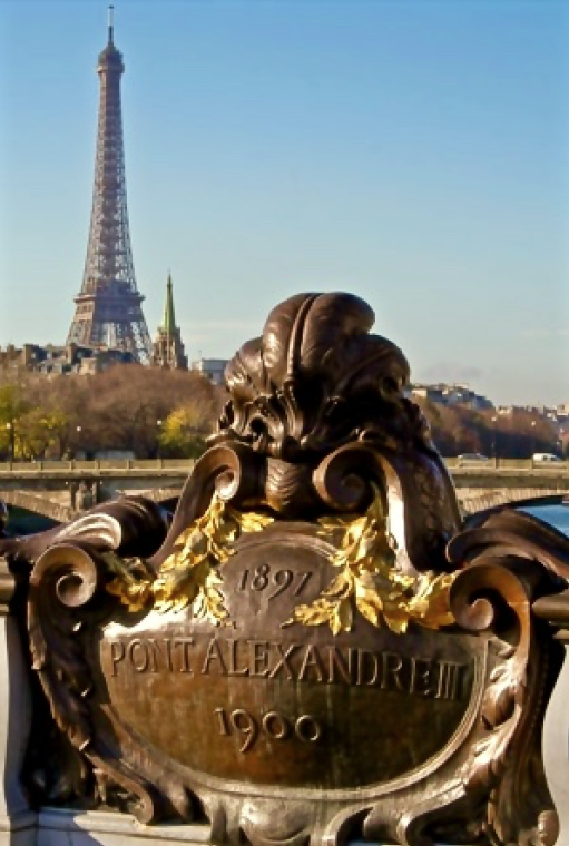 **The Pont Alexandre III, the Beaux-Arts style bridge, with its exuberant Art Nouveau lamps, cherubs, nymphs and winged horses at either end, was built between 1896 and 1900. It is named after Tsar Alexander III, who had concluded the Franco-Russian Alliance in 1892. His son Nicholas II laid the foundation stone in October 1896. (Pictures in collage are mine.)