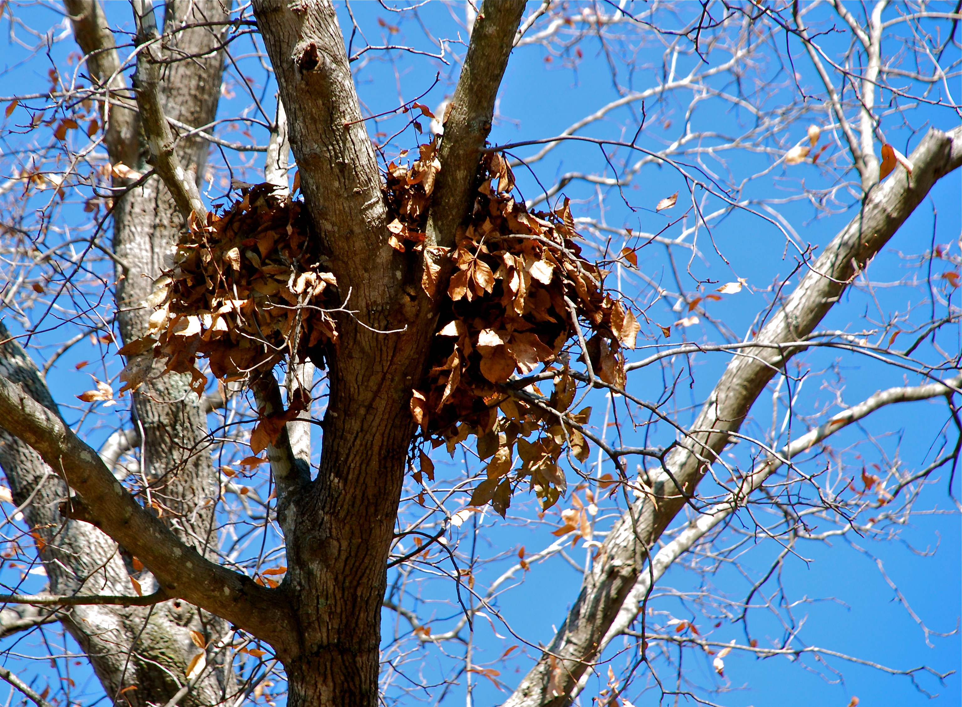 The fluffy-tailed creatures seem to have little fear of me, but they become alarmed if and when a feral cat begins to stalk them.  To date, though they’ve barely escaped being pounced upon a time or two, they’ve perceived the threat in time and avoided being captured by scampering up, up, and away into places too lofty for most cats to follow.  Afterwards the escapee sometimes stays on high making chicken-like noises, until I, the games keeper, chase the predator away, or the cat grows weary of the clucking and leaves of its own accord, or the squirrel’s attention is diverted to or by something else.