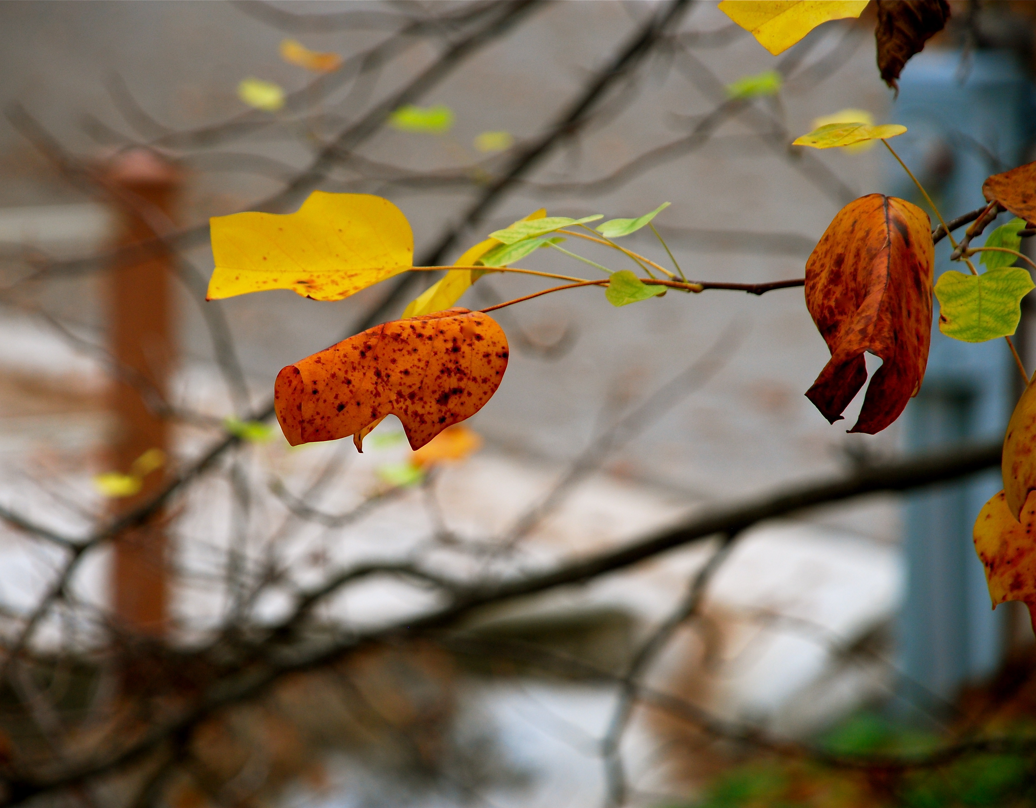 The first Sunday of November had been running out like slow, thick molasses as deepening autumn’s shades of gray hung on it like a shroud.  Even the flocks of busying birds and the foraging squirrels succumbed, as did I, to the hypnotic laziness of the day’s dark, engulfing gloom.  However, things became a little livelier for a time late in the day when the cement on the patio became a dance floor filled with tiny rain-drop dancers jitterbugging to the short-lived “drippy” rhythms.  After the rainy spell light broke briefly through the clouds, and it was enough to highlight a few colorful leaves and a potted petunia.  Together those two sights interjected a touch of color while the wrought-iron furniture that glistened in the light added a bit of beaded elegance to the drab scene.  How sweetly even a token display of earth’s delights can thrill this observer!